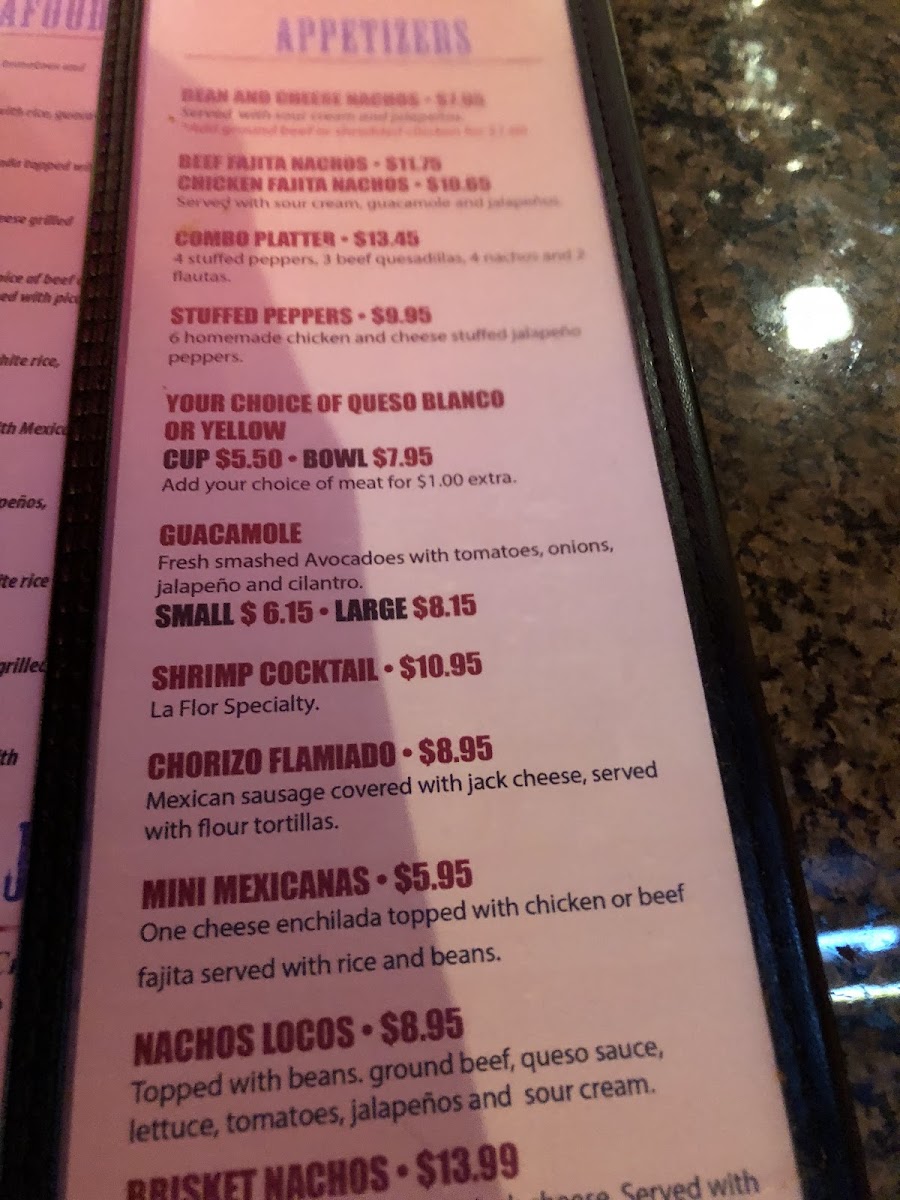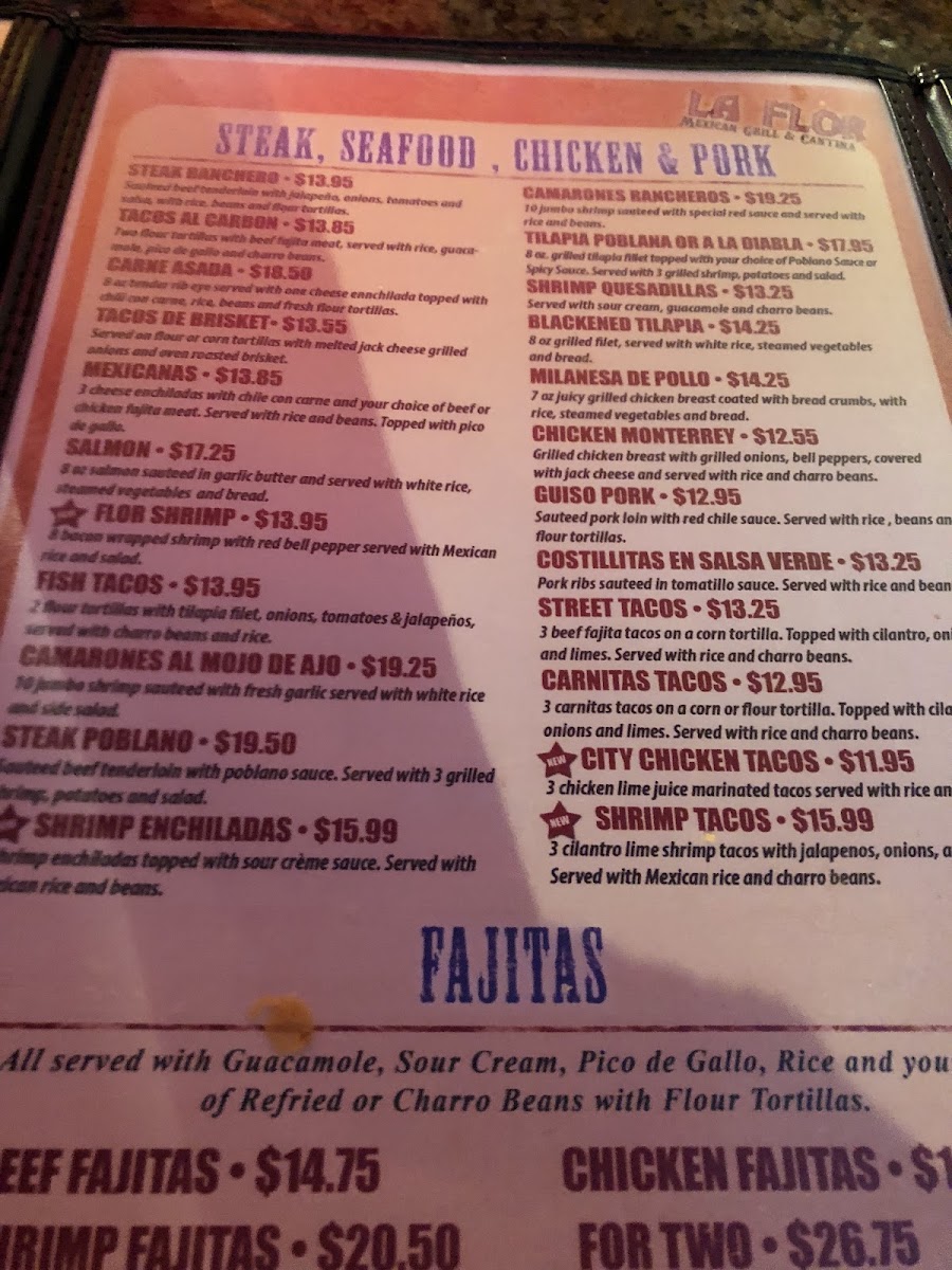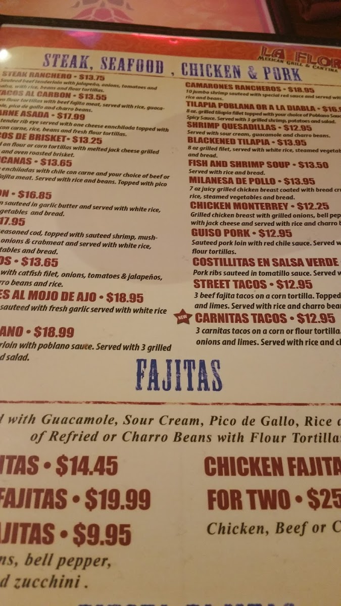 The menu at La Flor Murphy offers a wide variety of delicious options that cater to different tastes and cravings. For appetizers, guests can enjoy choices like Bean and Cheese Nachos and Chile Con Queso, or try the more indulgent Brisket Nachos and Stuffed Peppers. Breakfast options are plentiful, including favorites such as Huevos A La Mexicana and Chilaquiles Verdes Con Bisteq, alongside drinks like Iced Tea, Milk, and Orange Juice. For those craving a heartier meal, the dinner menu features flavorful dishes like Beef Fajitas, Chipotle Shrimp Fettuccine, and Tilapia Poblano. The Mexican Platters and Combo Plates offer tempting choices, including Tamale Dinner and Chicken Enchilada Dinner. For something lighter, there are soups and salads like Chicken Tortilla Soup and Grilled Shrimp Salad. The kid's menu is perfect for younger diners, with options like Chicken Nuggets, Corn Dog, and Kids Cheese Quesadilla. A selection of delicious desserts, such as Tres Leches Cake and Homemade Flan, round out the meal, while the drinks menu offers refreshing choices like Chocolate Milk and Soft Drinks. Whether you're in the mood for something traditional or looking to try something new, La Flor Murphy has a diverse menu that promises to satisfy.